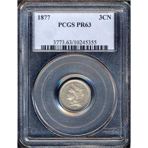 <b>1877 Nickel Three Cents. PCGS graded Proof 63.</b> Low mintage of around 900 Proofs (this being a Proof-only date). Some sources argue as to how many were actually struck since Mint records are obscure on Proof totals until standardization arrived in 1878. Glowing nickel-gray to silver color erupts from original surfaces untouched by spotting and only gently toned. A strong strike as well, making this 1877 key date an advantageous coin for the focused collector <b>(PCGS # 3773)</b> <i>
