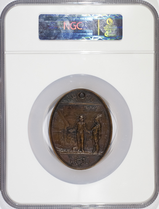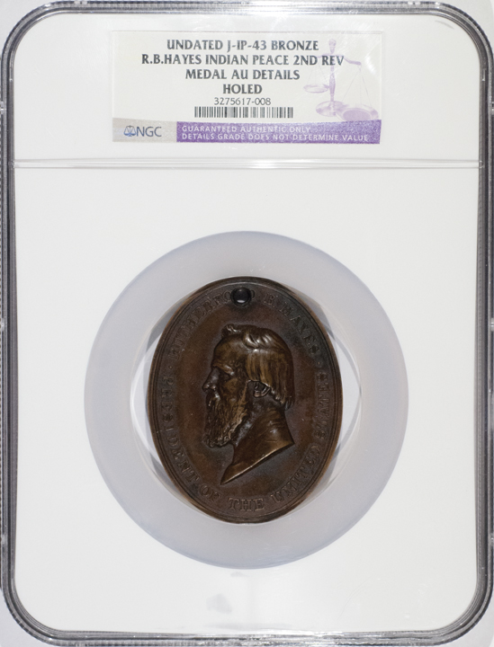 Julian IP-43. 75.5 x 59.5 mm. This rare, original “Oval” Rutherford B. Hayes Indian Peace Medal depicts the bust of Hayes facing to the left, and on the reverse it depicts a Settler standing before his cabin, apparently explaining “civilized” living to a Native American Indian Chief, wearing his Eagle feathered headdress. The word “PEACE” in rays at top, the variety showing no date at top as on the Julian plate. This medal is very clean and has a natural, even chestnut-brown patina, hole at top for wearing on display. This rare Oval medal is handsomely housed in its special, 7.25” x 5.75” custom NGC Certification display type holder.