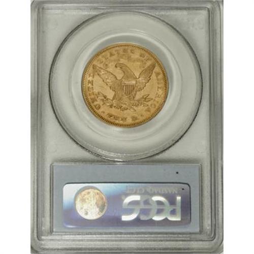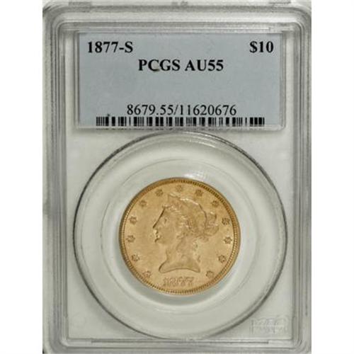 <B>1877-S $10 AU55 PCGS.</B></I> A shining and highly attractive representative of this S-mint issue, one of just 17,000 pieces minted. The centers are well-defined, though the outer stars show a touch of softness. Highly appealing despite minor wear on the devices and a number of light, scattered abrasions. A challenging piece for the Registry collector. Population: 2 in 55, 2 finer (7/07).<BR><BR><B>Coin Engraver:</B> Christian Gobrecht<BR><BR><b>Shipping:</b> Coins & Currency (<a target="_blank" href="http://www.heritageauctions.com/common/shipping.php">view shipping information</a>\)