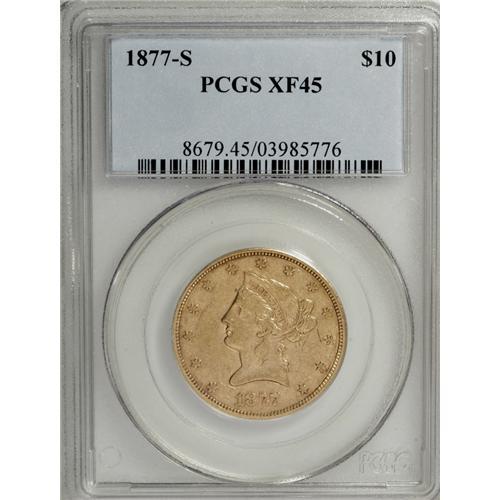1877-S $10 XF45 PCGS. Luster brightens the stars and l