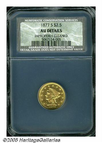 <B>1877-S<$2 1/2> AU Details, Improperly Cleaned, NCS.</B></I> A coin that must be seen to be fully appreciated, this nicely struck Quarter Eagle has had a mild chemical cleaning, but possesses a majority of its original luster and lacks the heavy abrasions sometimes encountered.