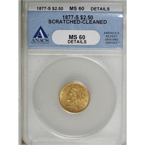 <B>1877-S $2 1/2 --Cleaned, Scratched--ANACS. MS60 Details.</B></I> NGC Census: (5/133). PCGS Population (2/67). Mintage: 35,400. Numismedia Wsl. Price for NGC/PCGS coin in MS60: $600. (#7827)<BR><BR><B>Coin Engraver:</B> Christian Gobrecht<BR><BR><b>Shipping:</b> Coins & Currency (<a target="_blank" href="http://www.heritageauctions.com/common/shipping.php">view shipping information</a>)
