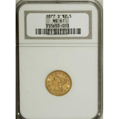 <B>1877-S $2 1/2 MS61 NGC.</B></I> This meticulously struck S-mint example has fewer marks than expected of the grade, and the borders display formidable cartwheel sheen. Scarce in Mint State compared with the post-Victorian dates. Census: 66 in 61, 65 finer (6/07).<BR><BR><b>Shipping:</b> Coins & Currency (<a target="_blank" href="http://www.heritageauctions.com/common/shipping.php">view shipping information</a>)