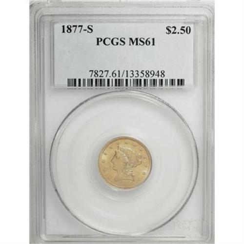 <B>1877-S $2 1/2 MS61 PCGS.</B></I> A lustrous peach-gold quarter eagle with traces of grayish color on the highpoints. Nicely struck, and a few minute marks. Population: 18 in 61, 49 finer (11/07).<BR><BR><B>Coin Engraver:</B> Christian Gobrecht<BR><BR><b>Shipping:</b> Coins & Currency (<a target="_blank" href="http://www.heritageauctions.com/common/shipping.php">view shipping information</a>)