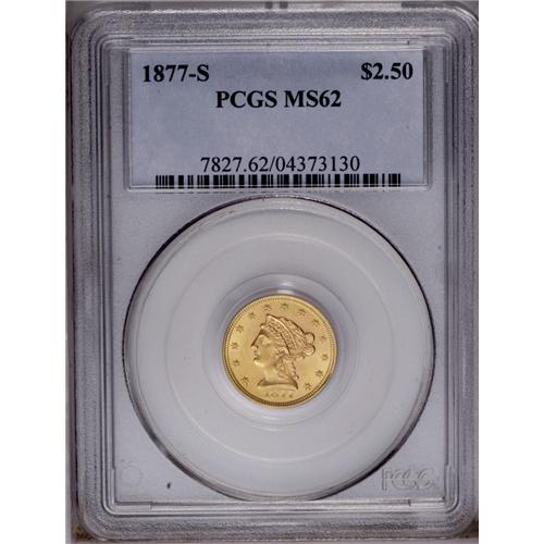 <B>1877-S<$2 1/2> MS62 PCGS.</B></I> This intricately struck example gives the initial appearance of a finer grade. Only thorough inspection and rotation locates a few wispy marks on the cheek. The mintage of 35,400 pieces ensures Uncirculated survivors are elusive. Population: 23 in 62, 23 finer (2/06).
