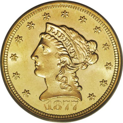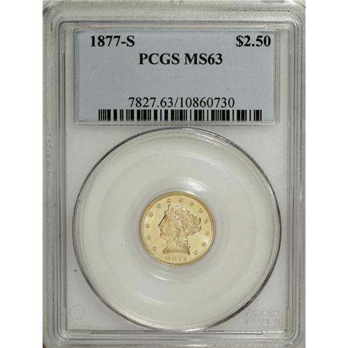 <B>1877-S $2 1/2 MS63 PCGS.</B></I> A semi-prooflike jewel with a penetrating strike and surprisingly clean surfaces. An ice-blue fleck within the D in the denomination is barely worthy of mention. The 1877-S is scarce in any Uncirculated grade, and becomes rare at the MS63 level. Population: 16 in 63, 9 finer (11/06).<BR><BR><b>Shipping:</b> Coin/Currency (<a target="_blank" href="http://www.heritageauctions.com/common/shipping.php">view shipping information</a>)
