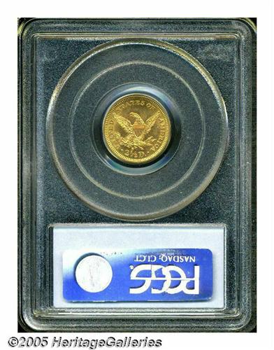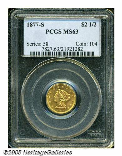 <B>1877-S<$2 1/2> MS63 PCGS.</B></I> Potent luster and rich orange color confirm the originality of this sharply struck Quarter Eagle. One of the last S-mint issues of the type, the 1877-S had a low production of 35,400 pieces and is infrequently encountered in any Mint State grade. Population: 14 in 63, 7 finer (3/05).