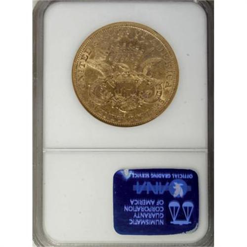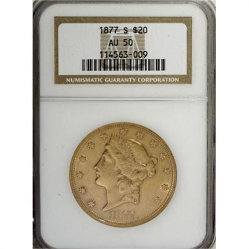 <B>1877-S $20 AU50 NGC.</B></I> The details are very strong on this AU example. There is a bit of luster at the peripheries and in the protected areas, and the surfaces show fewer marks than normally seen on lightly circulated gold coins of this size. <BR><I>From The York/Hallenbeck #2 Current Finest PCGS Registry Set of Liberty Double Eagles.</B></I><BR><BR><B>Coin Engraver:</B> James B. Longacre<BR><BR><b>Shipping:</b> Coins & Currency (<a target="_blank" href="http://www.heritageauctions.com/common/shipping.php">view shipping information</a>)