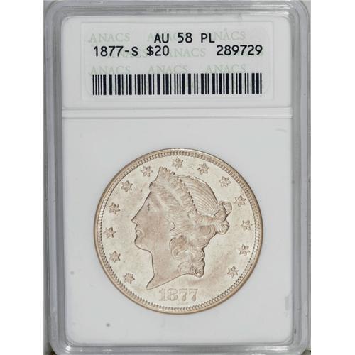 1877-S $20 AU58 Prooflike ANACS. A touch of highpoint