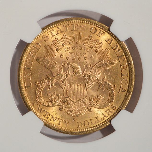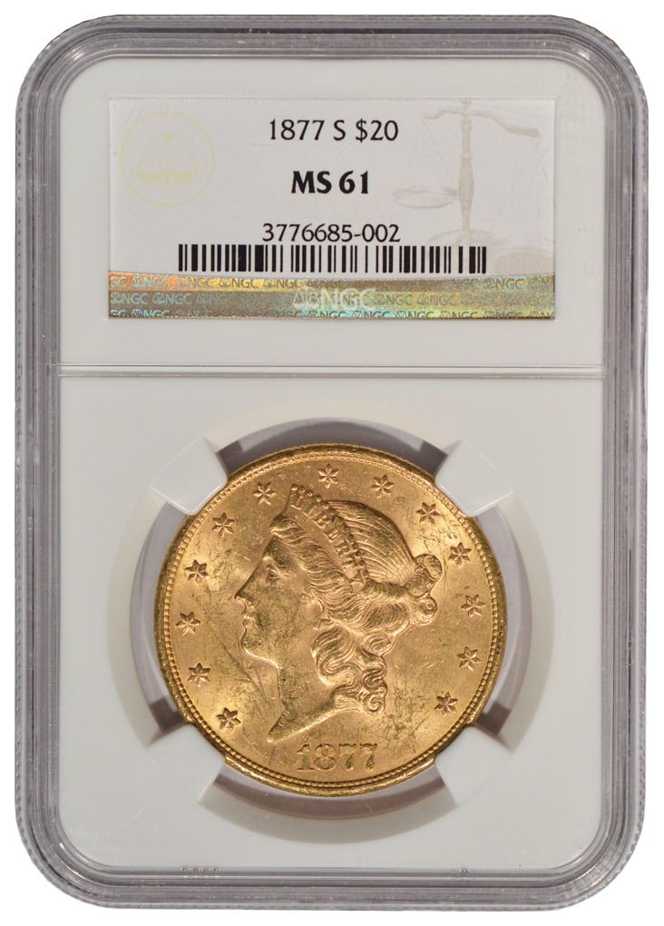 One 1877-S $20 Liberty Head Double Eagle Gold Coin NGC MS61.