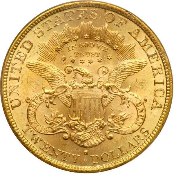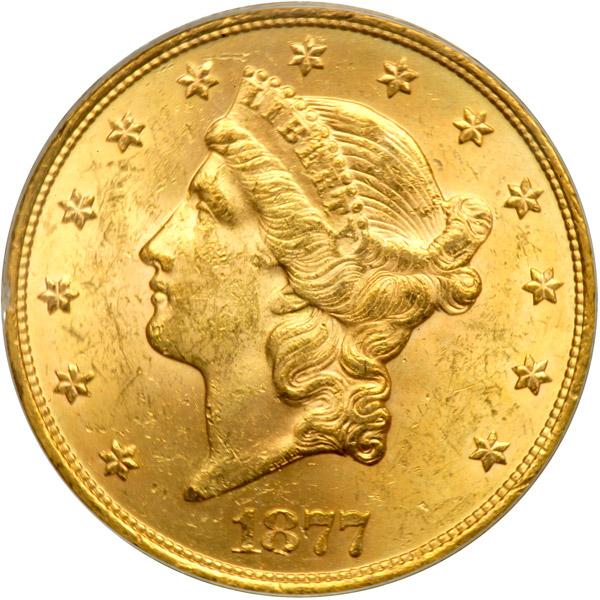 1877-S $20 Liberty. PCGS graded MS-62. Very frosty with light golden toning. This year introduced the Type 3 format with a modified Liberty head, more centrally positioned and the reverse heavily modified. For the first time, the denomination is spelled in its entirety TWENTY DOLLARS. Pop 212; 24 finer, 21 in 63, 2 in 64, 1 in 65 (PCGS # 8984) .