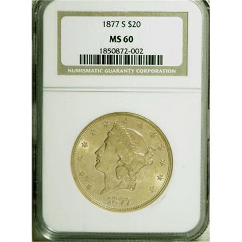1877-S $20 MS60 NGC. NGC Census: (315/646). PCGS P