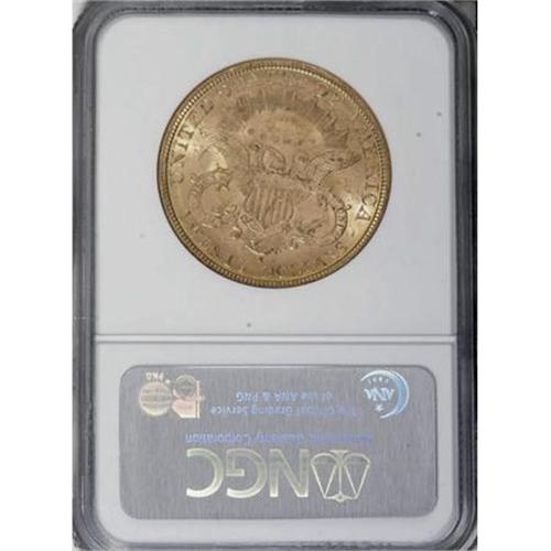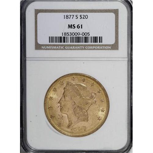 <B>1877-S $20 MS61 NGC.</B></I> A splendid Mint State representative, and not often seen so fine. This piece has lovely orange and yellow-gold luster.<BR><BR><b>Shipping:</b> Coins & Currency (<a target="_blank" href="http://www.heritageauctions.com/common/shipping.php">view shipping information</a>)