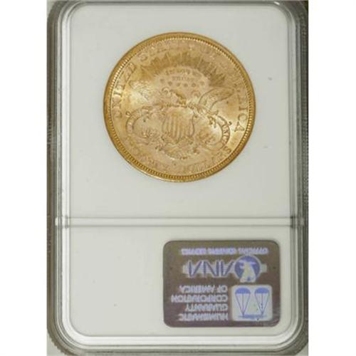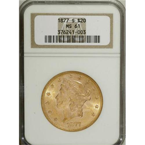 <B>1877-S $20 MS61 NGC.</B></I> NGC Census: (538/108). PCGS Population (229/186). Mintage: 1,735,000. Numismedia Wsl. Price for NGC/PCGS coin in MS61: $900. (#8984)<BR><BR><B>Coin Engraver:</B> James B. Longacre<BR><BR><b>Shipping:</b> Coins & Currency (<a target="_blank" href="http://www.heritageauctions.com/common/shipping.php">view shipping information</a>\)