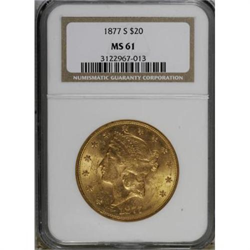 <B>1877-S $20 MS61 NGC.</B></I> Pleasingly detailed for this first-year Type Three double eagle issue with satiny yellow-orange surfaces. Numerous fine abrasions are present on each side, and the portrait shows a handful of more significant marks.<BR><BR><B>Coin Engraver:</B> James B. Longacre<BR><BR><b>Shipping:</b> Coins & Currency (<a target="_blank" href="http://www.heritageauctions.com/common/shipping.php">view shipping information</a>)