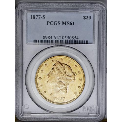 <B>1877-S<$20> MS61 PCGS.</B></I> A crisply struck example of the newly introduced Type Three design. Flashy fields ensure the eye appeal, although small obverse marks are distributed.
