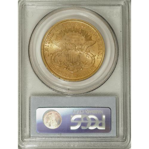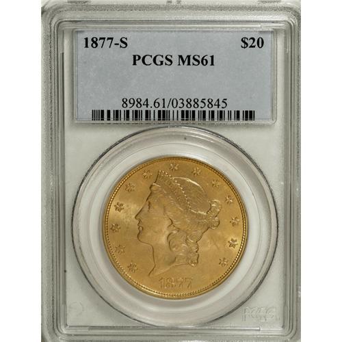 <B>1877-S $20 MS61 PCGS.</B></I> The first year of the Type Three design with the denomination spelled out in its entirety, this issue is scarce in Mint State like so many of the San Francisco Mint double eagles. Both sides have frosty yellow-gold luster with scattered marks that are expected for the grade.<BR><BR><b>Shipping:</b> Coins & Currency (<a target="_blank" href="http://www.heritageauctions.com/common/shipping.php">view shipping information</a>)