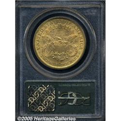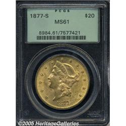 <B>1877-S $20 MS61 PCGS.</B></I> This older holder representative exhibits blazing luster and a crisp strike. A reeding mark is concealed within the hair above the forehead.