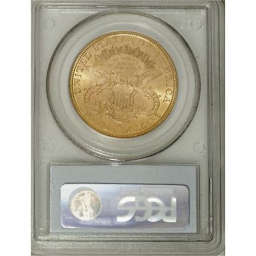 <B>1877-S $20 MS61 PCGS.</B></I> This solidly struck S-mint double eagle is predominantly yellow-gold with splashes of orange at the upper right obverse. Strongly lustrous with numerous grade-defining abrasions on and around the portrait.<BR><BR><B>Coin Engraver:</B> James B. Longacre<BR><BR><b>Shipping:</b> Coins & Currency (<a target="_blank" href="http://www.heritageauctions.com/common/shipping.php">view shipping information</a>)