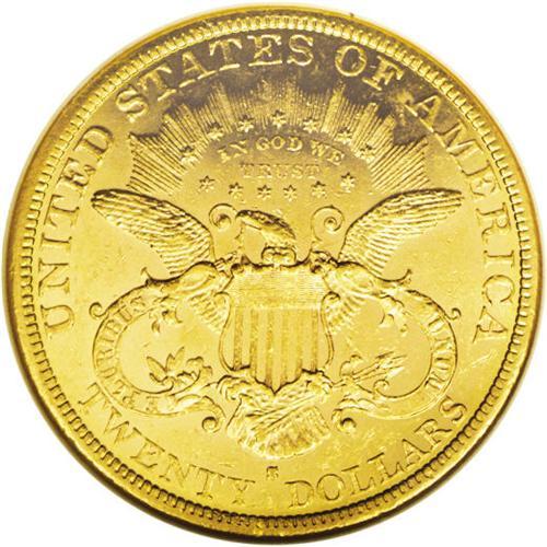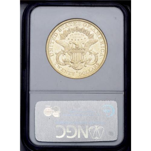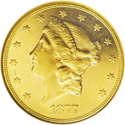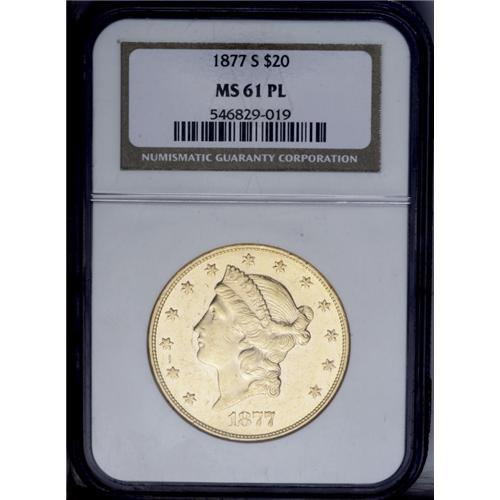 <B>1877-S<$20> MS61 Prooflike NGC.</B></I> A gorgeous yellow-gold example with great reflectivity and somewhat satiny devices. Nicely struck for this issue with the assortment of marks one would expect for the grade. Only two Mint State examples of this issue have been certified by NGC as prooflike (7/06).<BR><I>From The New York Eye Appeal Collection.</B></I>