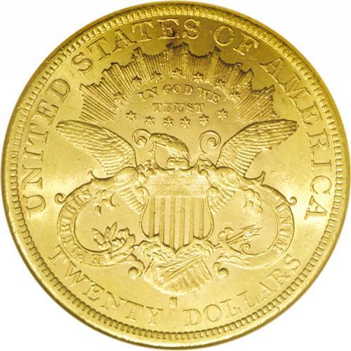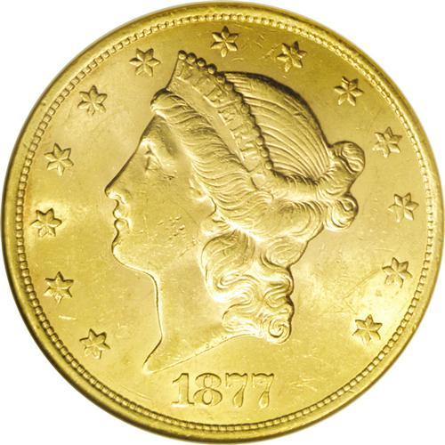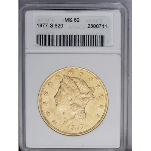 <B>1877-S $20 MS62 ANACS.</B></I> Bright and satiny with scattered abrasions on the obverse that culminate in several reeding marks at the center of Liberty's cheek. While occasionally available at the present grade level, this first year Type Three issue is rarely seen finer.