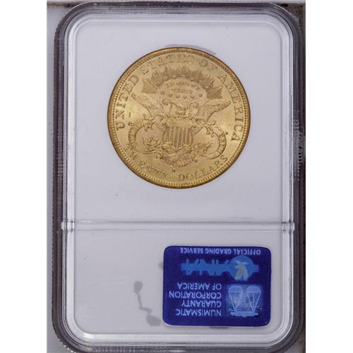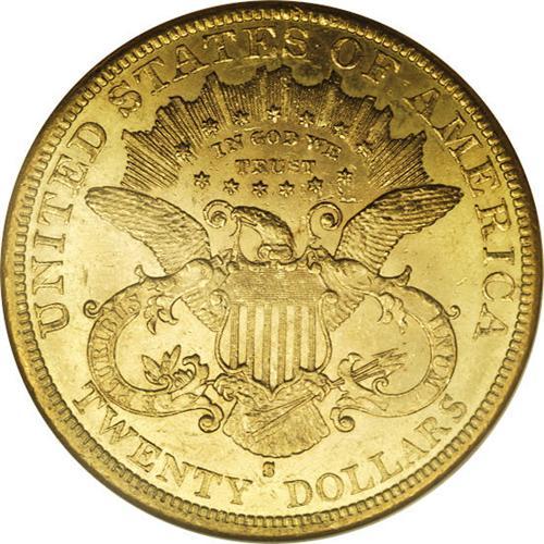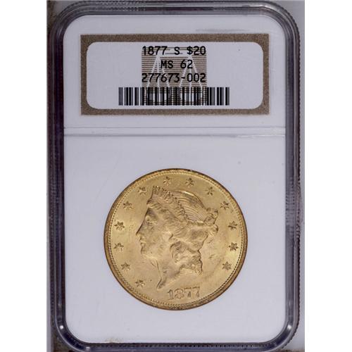 <B>1877-S<$20> MS62 NGC.</B></I> This is a lovely example that is approaching Condition Census level for the date. It is a lustrous and attractive representative of the first coinage issue of the new Type Three design. The surfaces are frosty and lustrous with attractive yellow-gold color. Census: 89 in 62, 4 finer (3/06).