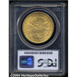 <B>1877-S<$20> MS62 PCGS.</B></I> Honey-gold patina graces both sides of this moderately lustrous coin that reveals well struck design features. A few light marks that are consistent with the grade are evident, particularly on the obverse. Population: 92 in 62, 10 finer (3/04). <BR><BR><B>Important notice:</B> Heritage usually auctions material at the rate of 200-250 lots per hour. On some occasions eBay Live bid software or the Internet may not be able to keep up with the pace of the auction. We recommend placing a realistic absentee bid now as insurance to avoid disappointment. Occasionally the auctioneer may eliminate or reject an eBay Live bid, and the auctioneer may also reopen a lot after the close of the eBay live bidding (usually because we missed an audience bid), and may reject your bid even if it shows you as the winning bidder. By bidding via eBay Live, you agree that Heritage may award the lot to another bidder at its sole discretion under the circumstances described above or any other reasonable circumstances. Since eBay bids are not shown to us until we open the lot on the floor, we treat those bids just like floor bids. In most cases the floor responds before the eBay bid is presented to us, due to Internet lag time, so for consistency we have made it a policy that floor bids are always considered first over tie eBay live bids. Also please note that all Heritage lots purchased through eBay Live carry a 20% Buyer's Premium. Please make sure you read the Terms and Conditions before you bid. </span></font></tr></table></td></tr></table>