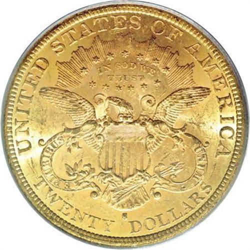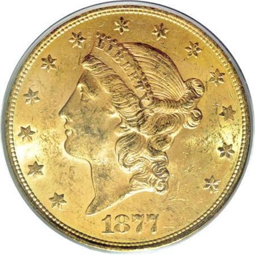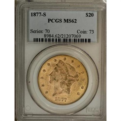 <B>1877-S $20 MS62 PCGS.</B></I> Most of the known survivors are in the grade range of AU58 to low-end Uncirculated. Garrett and Guth (2006) also had this to say about the '77-S: "Like so many double eagle issues, the date becomes very rare above MS63." This example has good color and luster, and is just a bit too baggy for a finer grade.<BR><BR><B>Coin Engraver:</B> James B. Longacre<BR><BR><b>Shipping:</b> Coins & Currency (<a target="_blank" href="http://www.heritageauctions.com/common/shipping.php">view shipping information</a>)
