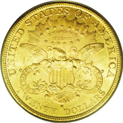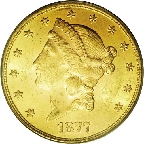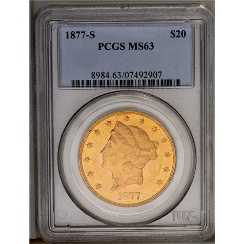 <B>1877-S<$20> MS63 PCGS.</B></I> This is a wonderful representative of the new Type Three design, and a condition rarity in the double eagle series. When collectors and numismatists think of the new design, the immediate change that comes to mind is the expanded version of the denomination, which now reads TWENTY DOLLARS rather than the former TWENTY D. Less thought is given to the obverse with its modified placement of the head of Liberty. The bust line is at a steeper angle and the coronet point is now centered between stars 6 and 7. The older type had the coronet point just below star 7. The example offered here is one of the finest survivors with frosty yellow-gold luster and wispy pink toning. Light abrasions on each side are consistent with the grade. The PCGS population data explains the importance of this example. Population: 18 in 63, 3 finer (6/06).