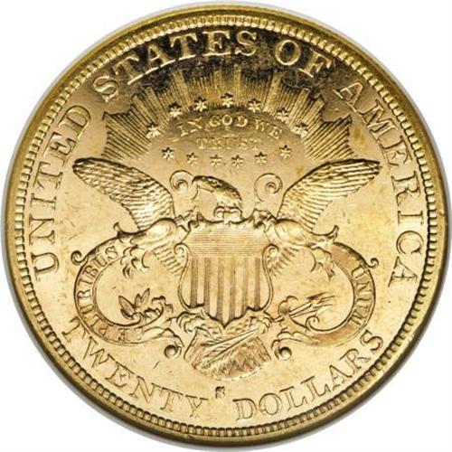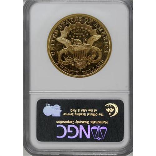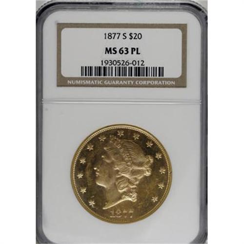 <B>1877-S $20 MS63 Prooflike NGC.</B></I> The issues of 1877 marked the debut of the Type Three double eagles, which had the full denomination of TWENTY DOLLARS spelled out on the reverse. As a general rule, the 1877-S is easily procured through MS62, but Select and better pieces are condition rarities. Adding Prooflike status to the list of prerequisites further narrows the available candidates.<BR> In fact, of the four Prooflike representatives certified by NGC, this MS63 coin is the single finest (11/07). The honey-gold and straw-yellow surfaces offer an enticing gleam, and the strike is crisp. Though the fields and portrait show a number of light abrasions, the overall visual appeal is surprisingly strong for the grade assigned.<BR><I>From The New York Eye Appeal Collection, Part Three.</B></I><BR><BR><B>Coin Engraver:</B> James B. Longacre<BR><BR><b>Shipping:</b> Coins & Currency (<a target="_blank" href="http://www.heritageauctions.com/common/shipping.php">view shipping information</a>)