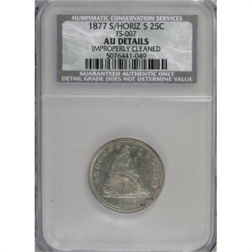 <B>1877-S/S 25C Horizontal S--Improperly Cleaned--NCS. AU Details.</B></I> FS-007. NGC Census: (2/258). PCGS Population (7/276). Mintage: 8,996,000. Numismedia Wsl. Price for NGC/PCGS coin in AU50: $120. (#5506)<BR><BR><B>Coin Engraver:</B> Christian Gobrecht<BR><BR><b>Shipping:</b> Coins & Currency (<a target="_blank" href="http://www.heritageauctions.com/common/shipping.php">view shipping information</a>)