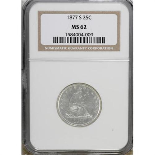 <B>1877-S 25C MS62 NGC.</B></I> . NGC Census: (36/174). PCGS Population (40/185). Mintage: 8,996,000. Numismedia Wsl. Price for NGC/PCGS coin in MS62: $321. (#5506)<BR><BR><B>Coin Engraver:</B> Christian Gobrecht<BR><BR><b>Shipping:</b> Coins & Currency (<a target="_blank" href="http://www.heritageauctions.com/common/shipping.php">view shipping information</a>)
