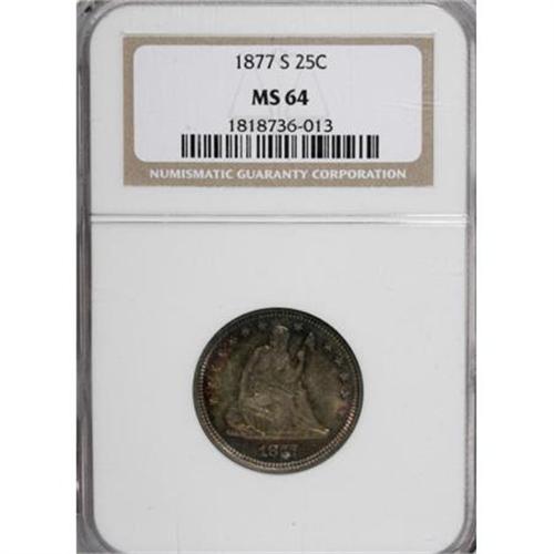 <B>1877-S 25C MS64 NGC.</B></I> Beautifully toned with powerful luster and bold definition beneath the patina. The sapphire and green-gold shadings that are prevalent on the obverse yield to canary and sun-yellow on the obverse with occasional blue-green accents.<BR><BR><B>Coin Engraver:</B> Christian Gobrecht<BR><BR><b>Shipping:</b> Coins & Currency (<a target="_blank" href="http://www.heritageauctions.com/common/shipping.php">view shipping information</a>)