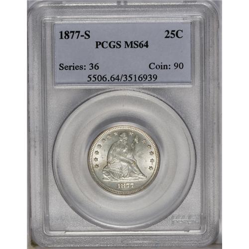 <B>1877-S<25C> MS64 PCGS.</B></I> Choice and attractive with good luster and hints of toning in olive-gold and dark red. Light abrasions and a soft strike limit the grade. This is an excellent coin to select for a high-grade type set.