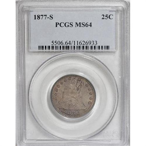 <B>1877-S 25C MS64 PCGS.</B></I> With a mintage of nearly 9 million pieces, the 1877-S is one of the most available Seated quarters in the series (Larry Briggs, 1991). Pleasing luster glows under a coat of medium intensity golden-gray patina imbued with light blue accents. Some light vertical toning streaks are noted on the obverse. Well preserved throughout. Population: 76 in 64, 35 finer (6/07).<BR><BR><b>Shipping:</b> Coins & Currency (<a target="_blank" href="http://www.heritageauctions.com/common/shipping.php">view shipping information</a>)