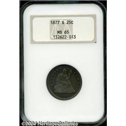 <B>1877-S<25C> MS65 NGC.</B></I> Deep sea-green, tobacco-brown, and powder-blue colors surround this nicely struck and shimmering Gem. Housed in a prior generation, pre-hologram NGC holder. Population: 22 in 65, 4 finer (4/04). <BR><BR><B>Important notice:</B> Heritage usually auctions material at the rate of 200-250 lots per hour. On some occasions eBay Live bid software or the Internet may not be able to keep up with the pace of the auction. We recommend placing a realistic absentee bid now as insurance to avoid disappointment. Occasionally the auctioneer may eliminate or reject an eBay Live bid, and the auctioneer may also reopen a lot after the close of the eBay live bidding (usually because we missed an audience bid), and may reject your bid even if it shows you as the winning bidder. By bidding via eBay Live, you agree that Heritage may award the lot to another bidder at its sole discretion under the circumstances described above or any other reasonable circumstances. Since eBay bids are not shown to us until we open the lot on the floor, we treat those bids just like floor bids. In most cases the floor responds before the eBay bid is presented to us, due to Internet lag time, so for consistency we have made it a policy that floor bids are always considered first over tie eBay live bids. Also please note that all Heritage lots purchased through eBay Live carry a 20% Buyer's Premium. Please make sure you read the Terms and Conditions before you bid.