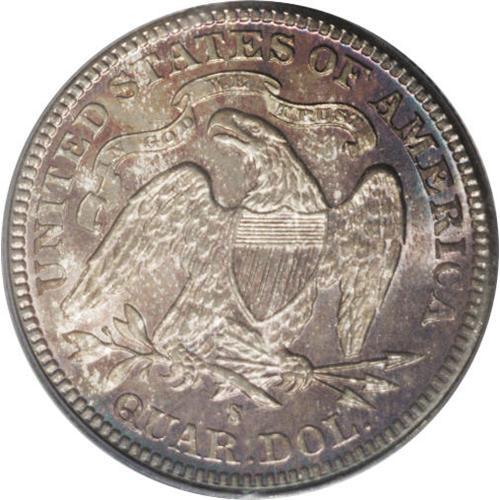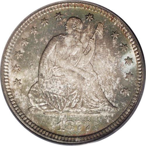 <B>1877-S<25C> MS65 PCGS.</B></I> Moderately toned and well struck. Intermittent shades of sea-green, purple-lilac, and tan-golden enhance each side and the underlying lustrous surfaces are virtually unmarked. Population: 28 in 65, 7 finer (4/06).