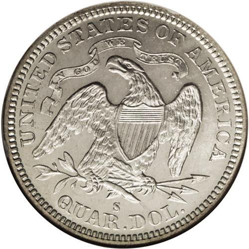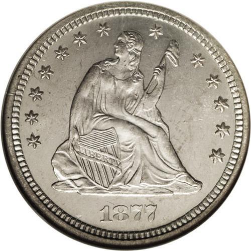 <B>1877-S<25C> MS66 NGC.</B></I> Frosty devices contrast with moderately prooflike fields. Type Two Reverse, with short feet on the A in STATES. The 1877-S is the last large mintage quarter issue from San Francisco until 1888, because the mints were compelled to strike silver dollars instead. This untoned and well struck Premium Gem is a worthy addition to an eighteenth century silver type set. Census: 2 in 66, 5 finer (4/06).