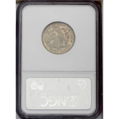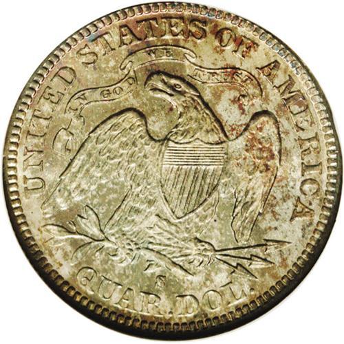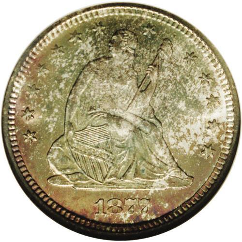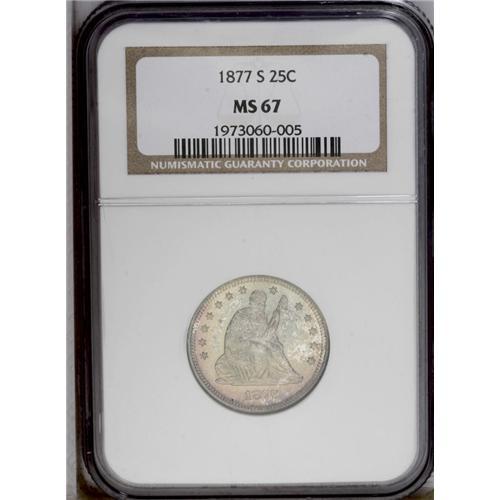 <B>1877-S<25C> MS67 NGC.</B></I> In the case of the 1877-S, the large mintage of almost 9 million pieces is a virtual guarantee of a high quality type coin. This was a well-produced issue, and in this particular case, the fields have a bit of semi-reflectivity with mint frost intermixed. Well, but not completely struck up, the surfaces are exceptionally clean. Speckled blue-green toning is seen on the obverse with a bit of golden-rose at the margin, while the reverse is mostly golden toned. An excellent With Motto Seated type coin and one of only four pieces so graded by NGC with none finer (2/06).