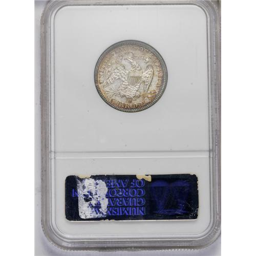 <B>1877-S<25C> Over Horizontal S MS63 NGC.</B></I> FS-007, Briggs 4-D. Medium golden-gray, rose, and electric-blue patina. Seated specialists are likely pleased that this important variety is not extensively collected, since there are not enough nice Mint State pieces to go around. Encased in a prior generation holder. Census: 4 in 63, 9 finer (6/06).