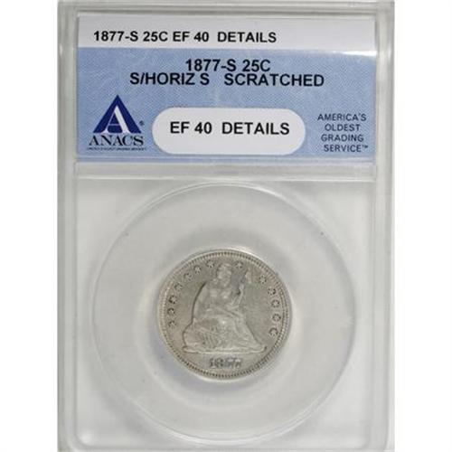 <B>1877-S 25C Over Horizontal S--Scratched--ANACS. XF40 Details.</B></I> NGC Census: (0/31). PCGS Population (0/36). Mintage: 8,900,000. Numismedia Wsl. Price for NGC/PCGS coin in XF40: $210. (#5507)<BR><BR><B>Coin Engraver:</B> Christian Gobrecht<BR><BR><b>Shipping:</b> Coins & Currency (<a target="_blank" href="http://www.heritageauctions.com/common/shipping.php">view shipping information</a>)