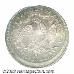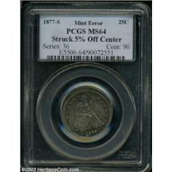 <table><tr><td><TABLE cellSpacing=0 cellPadding=0 width="100%" bgColor=#000000 border=0><TBODY> <TR><TD width="100%"><TABLE cellSpacing=1 cellPadding=3 width="100%" border=0><TBODY><TR><TD width="100%" bgColor=#79735c><FONT face=arial color=#ffffff size=3><B>Description</B> </FONT></TD></TR><TR><TD width="100%" bgColor=#ffffff><FONT face=arial size=2><B>1877-S 25C Quarter--Struck 5% Off Center--MS64 PCGS.</B></I> Original apple-green and mauve patina bathes this well preserved and satiny near-Gem. Struck 5% off center at 5 o'clock, with denticles below the date and above STATES absent from the flan. The date and much of UNITED STATES OF AMERICA has a 'stretched' appearance, as metal flowed to the borders without the restraint of a collar die. The major devices, however, are well struck. </FONT></TD></TR></TBODY></TABLE></TD></TR></TBODY></TABLE><BR><A name=PricesRealized></A><TABLE cellSpacing=0 cellPadding=0 width="100%" bgColor=#000000 border=0><TBODY><TR><TD width="100%"><TABLE cellSpacing=1 cellPadding=3 width="100%" border=0><TBODY><TR><TD width="100%" bgColor=#79735c><A name=PR><FONT face=arial color=#ffffff size=3><B>Previous Prices from Heritage Auctions</B> </FONT></A></TD></TR><TR><TD bgColor=#f6f6ed><TABLE cellSpacing=0 cellPadding=0 width="100%" border=1><TBODY><TR><TD align=middle width="33%"><B>Date</B></TD><TD align=middle width="33%"><B>Service</B></TD><TD align=middle width="33%"><B>Price</B></TD></TR><TR bgColor=whitesmoke><TD width="33%"><B>07/23/2002</B></TD><TD width="33%">NGC</TD><TD width="33%">$529.00</TD></TR><TR bgColor=whitesmoke><TD width="33%"><B>09/22/2003</B></TD><TD width="33%">PCGS</TD><TD width="33%">$552.00</TD></TR><TR bgColor=whitesmoke><TD width="33%"><B>11/15/2001</B></TD><TD width="33%">PCGS</TD><TD width="33%">$494.50</TD></TR><TR bgColor=whitesmoke><TD width="33%"><B>05/05/2000</B></TD><TD width="33%">PCGS</TD><TD width="33%">$632.50</TD></TR><TR bgColor=whitesmoke><TD width="33%"><B>05/29/1996</B></TD><TD width="33%">PCGS</TD><TD width="33%">$511.50</TD></TR><TR bgColor=whitesmoke><TD width="33%"><B>02/01/1998</B></TD><TD width="33%">NGC</TD><TD width="33%">$506.00</TD></TR></TBODY></TABLE></TD></TR><TR><TD bgColor=#ffffff><FONT face=arial size=1 ?>PLEASE NOTE: All prices realized reflect the final hammer price PLUS the buyer's premium in auctions that charge a buyer's premium. Each item has a notation at the top of the listing indicating whether that lot included a buyer's premium. Example: A item that sells with a final hammer price of $100 and a 20% buyer's premium will display with a price realized of $120. All information listed is intended to be as accurate as possible, but errors are possible. Please use this guide carefully and inform us of any inaccuracies. </FONT></TD></TR></TBODY></TABLE></TD></TR></TBODY></TABLE><BR><TABLE cellSpacing=0 cellPadding=0 width="100%" bgColor=#000000 border=0><TBODY><TR><TD width="100%"><TABLE cellSpacing=1 cellPadding=3 width="100%" border=0><TBODY><TR><TD width="100%" bgColor=#79735c colSpan=6><FONT face=arial color=#ffffff size=3><B>Price Guide*</B> </FONT></TD></TR><TR bgColor=#f6f6ed><TD align=middle><B>Grade</B> </TD><TD align=middle><B>Coin World<BR>(Trends)</B> </TD><TD align=middle><B>Numismedia<BR>Retail</B> </TD><TD align=middle><B>Numismedia<BR>Wholesale</B> </TD><TD align=middle><B>Coin<BR>Universe</B> </TD><TD align=middle><B>Heritage<BR>Value Index</B> </TD></TR><TR bgColor=#ffffff><TD align=middle>63</TD><TD align=right>$410.00</TD><TD align=right>$420.00</TD><TD align=right>$350.00</TD><TD align=right>$415.00</TD><TD align=right>$312.38</TD></TR><TR style="FONT-WEIGHT: bold" bgColor=#cccfdd><TD align=middle>64</TD><TD align=right>$775.00</TD><TD align=right>$810.00</TD><TD align=right>$650.00</TD><TD align=right>$650.00</TD><TD align=right>$508.88</TD></TR><TR bgColor=#ffffff><TD align=middle>65</TD><TD align=right>---</TD><TD align=right>---</TD><TD align=right>$1,150.00</TD><TD align=right>$1,675.00</TD><TD align=right>$1,117.17</TD></TR><TR bgColor=#ffffff><TD colSpan=6><FONT size=1>*All information listed is intended to be as accurate as possible, but errors are possible. No item may be returned or refused based on this information which is provided as a service to our customers. You should contact each pricing source directly to determine the accuracy of this information. </FONT></TD></TR></TBODY></TABLE></TD></TR></TBODY></TABLE><BR><TABLE cellSpacing=0 cellPadding=0 width="100%" bgColor=#000000 border=0><TBODY><TR><TD width="100%"><TABLE cellSpacing=1 cellPadding=3 width="100%" border=0><TBODY><TR><TD width="100%" bgColor=#79735c><FONT face=arial color=#ffffff size=3><B>Population Guide</B> </FONT></TD></TR><TR bgColor=#ffffff><TD align=middle><!-- Begin Output of Population Grid--><TABLE cellSpacing=0 cellPadding=0 width="100%" border=0><TBODY><TR><TD vAlign=center><TABLE cellSpacing=0 width="100%" border=1 cellsadding="3"><TBODY><TR><TD vAlign=center><TABLE cellSpacing=0 cellPadding=3 width="100%" border=1><TBODY><TR><TD vAlign=center align=middle bgColor=#f0f1e8 colSpan=2 <CENTER><FONT face=Arial size=2><B>PCGS Pop </B></FONT><CENTER></CENTER></TD><TD vAlign=center align=middle bgColor=#f0f1e8 colSpan=2><CENTER><FONT face=Arial size=2><B>NGC Pop</B></CENTER></FONT></TD></TR><TR><TD vAlign=center><FONT face=Arial size=2>(64)</FONT> </TD><TD vAlign=center align=right><FONT face=Arial size=2>64</FONT> </TD><TD vAlign=center><FONT face=Arial size=2>(64)</FONT> </TD><TD vAlign=center align=right><FONT face=Arial size=2>70</FONT> </TD></TR><TR><TD vAlign=center><FONT face=Arial size=2>(>64)</FONT> </TD><TD vAlign=center align=right><FONT face=Arial size=2>33</FONT> </TD><TD vAlign=center><FONT face=Arial size=2>(>64)</FONT> </TD><TD vAlign=center align=right><FONT face=Arial size=2>25</FONT> </TD></TR></TBODY></TABLE></TD></TR></TBODY></TABLE></TD></TR></TBODY></TABLE><!-- End Output of Population Grid--></TD></TR></TBODY></TABLE></TD></TR></TBODY></TABLE><BR><TABLE cellSpacing=0 cell