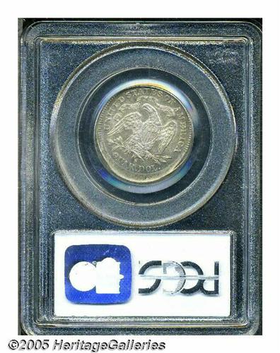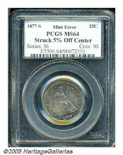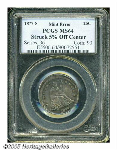 <B>1877-S<25C> Seated Quarter--Struck 5% Off Center--MS64 PCGS.</B></I> Struck several degrees off center toward 7 o'clock, the legends are intact but are moderately distorted, as made. This lustrous and meticulously struck near-Gem is beautifully preserved and displays original sea-green and steel-gray patina. Off center 19th century silver coins in high Uncirculated grades are exceptionally rare, and the present piece would be a main attraction in any advanced collection of mint errors.
