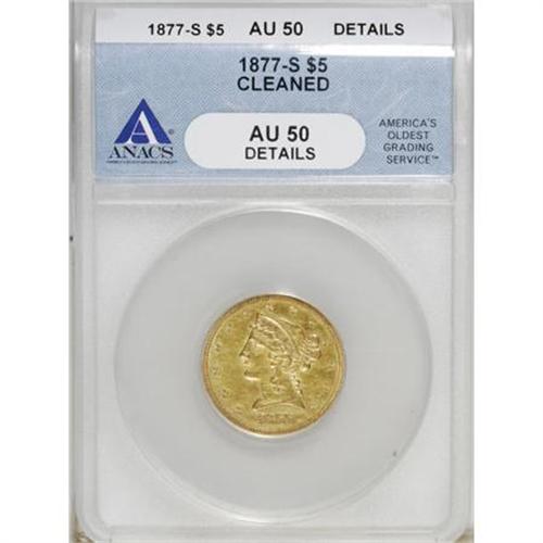 <B>1877-S $5 --Cleaned--ANACS AU50 Details.</B></I> NGC Census: (10/36). PCGS Population (14/11). Mintage: 26,700. Numismedia Wsl. Price for NGC/PCGS coin in AU50: $1,075. (#8344)<BR><BR><B>Coin Engraver:</B> Christian Gobrecht<BR><BR><b>Shipping:</b> Coins & Currency (<a target="_blank" href="http://www.heritageauctions.com/common/shipping.php">view shipping information</a>)