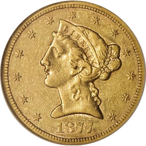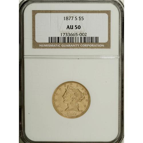 1877-S $5 AU50 NGC. A low mintage/low availability S-m
