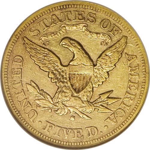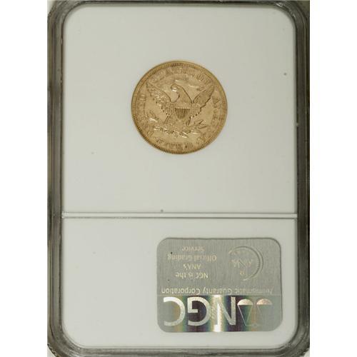 <B>1877-S $5 AU50 NGC.</B></I> A low mintage/low availability S-mint five that is rarely found any finer than AU, and usually not that fine. This piece has bright yellow-gold surfaces that are surrounded by reddish color at the margins. A bit softly struck in the centers, but well defined elsewhere.<BR><BR><b>Shipping:</b> Coins & Currency (<a target="_blank" href="http://www.heritageauctions.com/common/shipping.php">view shipping information</a>)