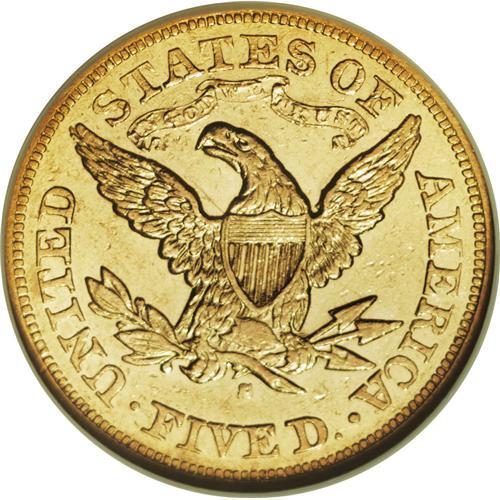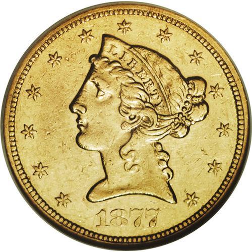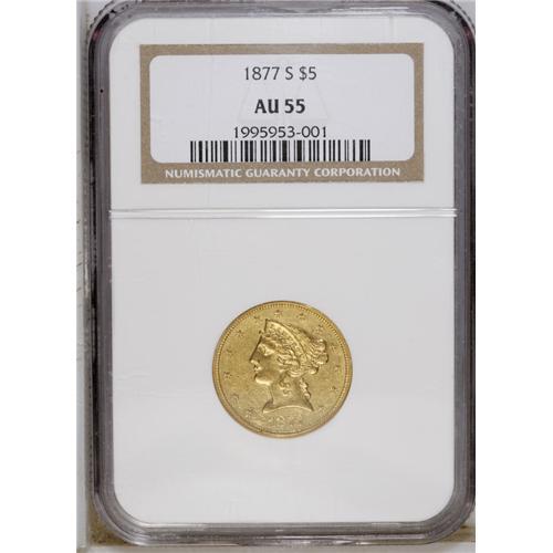 <B>1877-S $5 AU55 NGC.</B></I> Well struck and still-lustrous, with a high number of small abrasions on each side, and a larger mark on the lower left obverse, from near the date to just left of Liberty's chin. This low mintage issue of 26,700 pieces is scarce at all grade levels and rare in AU or Uncirculated condition. Census: 17 in 55, 7 finer (11/06).<BR><BR><b>Shipping:</b> Coin/Currency (<a target="_blank" href="http://www.heritageauctions.com/common/shipping.php">view shipping information</a>)
