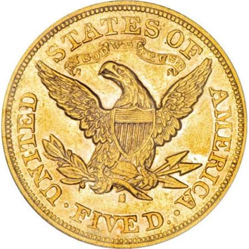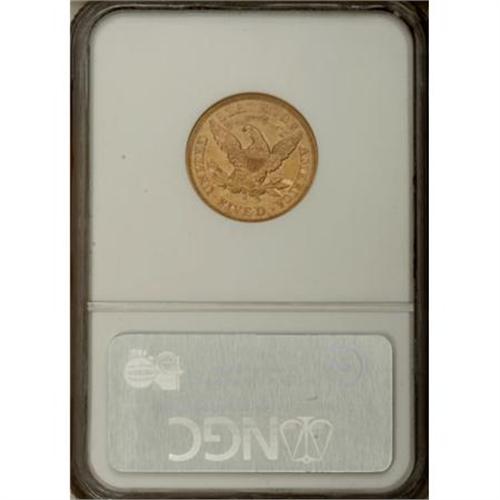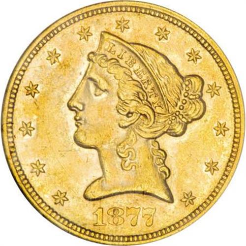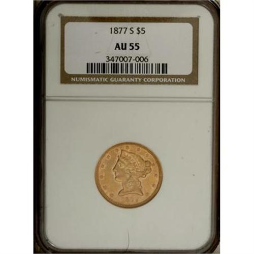 <B>1877-S $5 AU55 NGC.</B></I> A very scarce With Motto half eagle that is difficult in all grades and usually only seen in lower condition. There are very few survivors in AU, and only three pieces have been certified in Mint State, by both services combined. This is a bright, partially lustrous example that shows some softness of detail in the centers but pinpoint definition on the peripheral stars. A number of small and medium-sized abrasions are noted in the obverse and reverse fields. Census: 17 in 55, 8 finer (11/07).<BR><BR><B>Coin Engraver:</B> Christian Gobrecht<BR><BR><b>Shipping:</b> Coins & Currency (<a target="_blank" href="http://www.heritageauctions.com/common/shipping.php">view shipping information</a>)