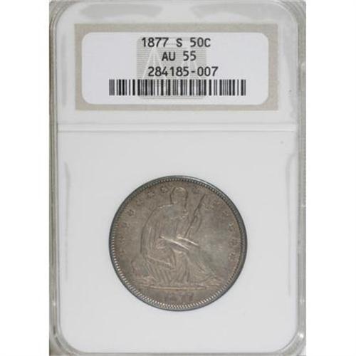 <B>1877-S 50C AU55 NGC.</B></I> NGC Census: (21/288). PCGS Population (24/283). Mintage: 5,356,000. Numismedia Wsl. Price for NGC/PCGS coin in AU55: $200. (#6357)<BR><BR><B>Coin Engraver:</B> Christian Gobrecht<BR><BR><b>Shipping:</b> Coins & Currency (<a target="_blank" href="http://www.heritageauctions.com/common/shipping.php">view shipping information</a>\)