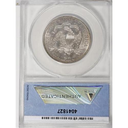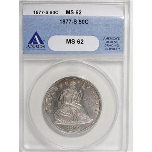 <B>1877-S 50C MS62 ANACS.</B></I> NGC Census: (41/183). PCGS Population (54/166). Mintage: 5,356,000. Numismedia Wsl. Price for NGC/PCGS coin in MS62: $480. (#6357)<BR><BR><B>Coin Engraver:</B> Christian Gobrecht<BR><BR><b>Shipping:</b> Coins & Currency (<a target="_blank" href="http://www.heritageauctions.com/common/shipping.php">view shipping information</a>)